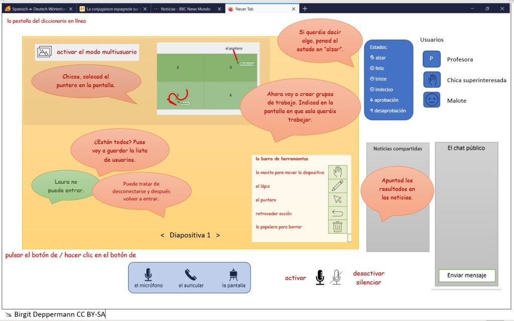 Keine Reise ohne sprachliche Herausforderungen! Ich habe noch nie an Videokonferenzen mit spanischen Muttersprachler*innen teilgenommen, also fehlte mir die Erfahrung des authentischen „español de las videoconferencias“. Geholfen hat schon einmal die Entdeckung, dass ich die Spracheinstellungen für die Konferenz verändern kann, wenn auch immer ein deutschsprachiger Rest bleibt. Außerdem habe ich mir ein paar spanischsprachige Erklärvideos angesehen und daraus die folgende Übersicht zusammengestellt, die auch die Schüler*innen nutzen: