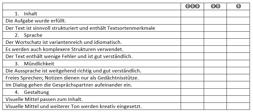 Die Schüler*innen bekommen die Übersicht zu Beginn des Kurses. Sie gehen die Liste durch und haken ab, was sie sicher zu können meinen. Dann tauschen sie sich untereinander über die schwierigeren Strukturen aus.